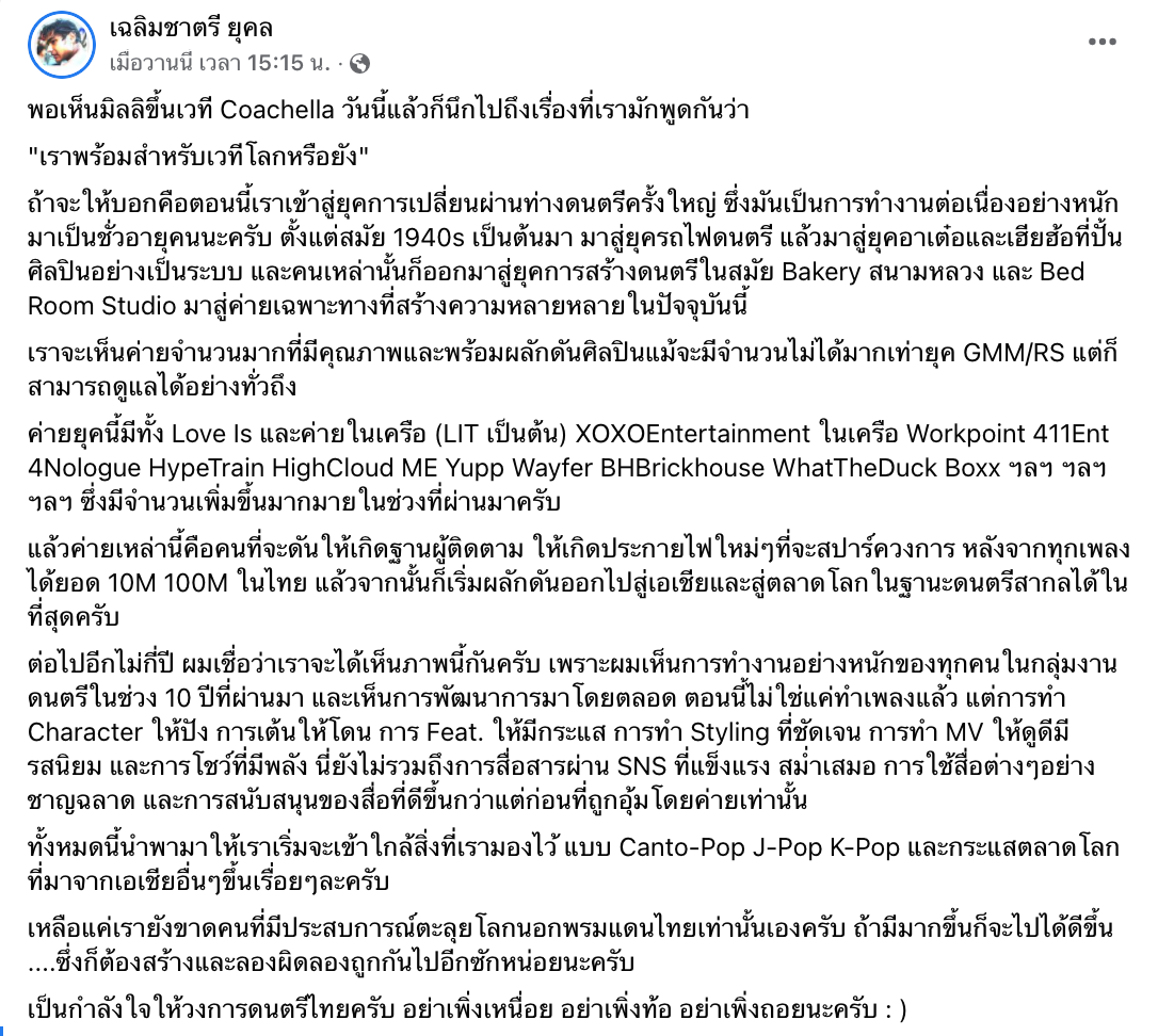 ต่อไปอีกไม่กี่ปี ผมเชื่อว่าเราจะได้เห็นภาพนี้กันครับ เพราะผมเห็นการทำงานอย่างหนักของทุกคนในกลุ่มงานดนตรีในช่วง 10 ปีที่ผ่านมา และเห็นการพัฒนาการมาโดยตลอด ตอนนี้ไม่ใช่แค่ทำเพลงแล้ว แต่การทำ Character ให้ปัง การเต้นให้โดน การ Feat. ให้มีกระแส การทำ Styling ที่ชัดเจน การทำ MV ให้ดูดีมีรสนิยม และการโชว์ที่มีพลัง นี่ยังไม่รวมถึงการสื่อสารผ่าน SNS ที่แข็งแรง สม่ำเสมอ การใช้สื่อต่างๆอย่างชาญฉลาด และการสนับสนุนของสื่อที่ดีขึ้นกว่าแต่ก่อนที่ถูกอุ้มโดยค่ายเท่านั้น