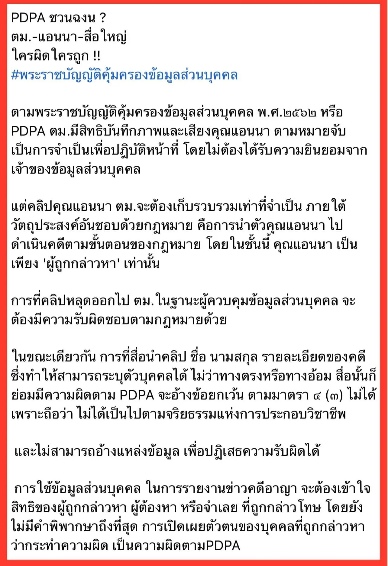 ส่วนประเด็นเรื่อง ‘พรบ.คุ้มครองข้อมูลส่วนบุคคล’ หรือ PDPA ซึ่งบังคับใช้เมื่อวันที่ 1 มิถุนายนที่ผ่านมา ในกรณีนี้ เข้าใจว่ายังคงเป็นที่ถกเถียงหรือตีความกันอยู่เรื่องการเปิดเผยภาพหรือชื่อผู้ถูกกล่าวหาในคดีอาญา ซึ่งที่แล้วมา ปกติทั่วไปในแวดวงสื่อ ถ้าเป็นกรณีเป็นบุคคลสาธารณะ เป็นที่รับรู้อยู่แล้ว ก็ไม่มีเหตุจะต้องบังชื่อหรือใบหน้า เหมือนเมื่อครั้งที่แอนนา เคยบอกให้ผมเปลี่ยนรูปในหมายจับที่มีการคาดดวงตา (ซึ่งเป็นภาพจากเจ้าหน้าที่)ให้มาใช้ภาพแอนนาสวยๆ ไม่ต้องคาดตา แต่หากกรณีผู้ต้องหาทั่วไป ก็จะปิดบังใบหน้า (ซึ่งสังคมก็มักจะตั้งคำถามว่าปิดทำไม)