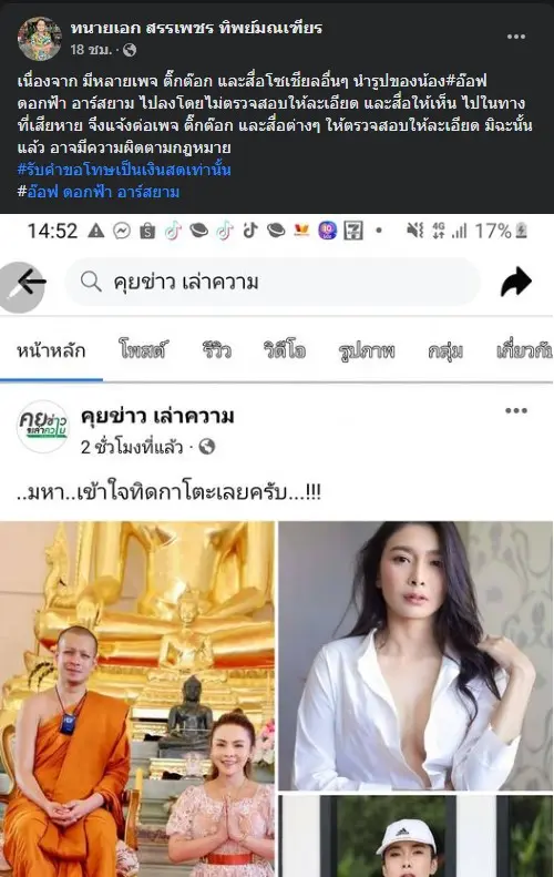 ก่อนที่เพจต้นทางที่นำรูปมาเผยแพร่ ได้ลบโพสต์ออก และโพสต์ข้อความขอโทษ อ๊อฟ ดอกฟ้า อาร์สยาม หน้าเพจแล้ว