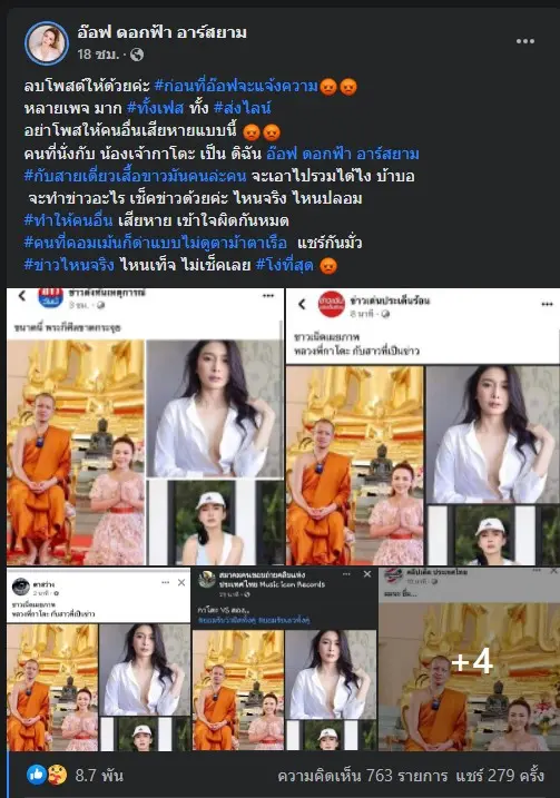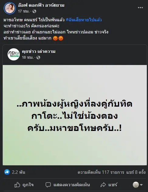 “แคปหลักฐานไว้แล้วค่ะ รอดำเนินคดีเลย เอารูปดิฉันมาโพสต์ ทำให้คนอื่นเสียหายแบบนี้ 😡😡รูปที่นั่งกับ น้องเจ้ากาโตะ เป็น ดิฉัน อ๊อฟ ดอกฟ้า อาร์สยาม#มันคนล่ะคน #กับสายเดี่ยวเสื้อขาว จะเอาไปรวมได้ไง บ้าบอจะทำข่าวอะไร เช็คข่าวด้วยค่ะ ไหนจริง ไหนปลอม#ทำให้คนอื่น เสียหาย เข้าใจผิดกันหมด #คนที่คอมเม้นก็ด่าแบบไม่ดูตาม้าตาเรือ แชร์กันมั่ว#ข่าวไหนจริง ไหนเท็จ ไม่เช็คเลย #โง่ที่สุด 😡”