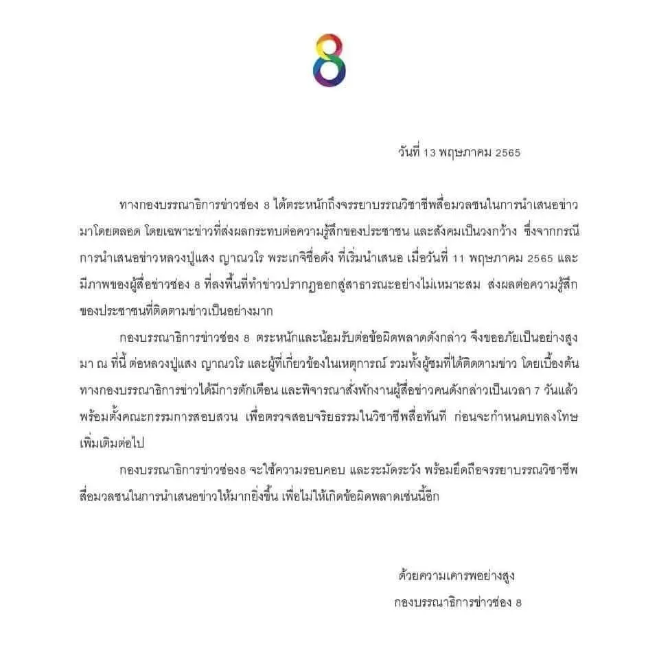“ผมขอแสดงสปิริต ด้วยการขอกล่าวขอโทษพี่ พร้อมพี่หม่ำ จ๊กม๊ก พี่นุ้ย เชิญยิ้ม พี่บอล เชิญยิ้ม และทุกๆคนที่ผนเคยร่วมงานกับช่องนี้ ผมกราบขอโทษด้วย แต่จริงๆผมรักพวกพี่นะ แต่ผมต้องแสดงสปิริตทุกสิ่งทุกอย่าง ผมจะไม่ขอไปก้าวล่วงช่องนี้ ถ้าผมยังจะออกไปเสนอหน้าช่องนี้อยู่ ถ้าน้อง…มันเห็น มันจะคิดยังไง นักข่าวสาวคนนี้ไม่ใช่เป็นเหยื่อหมอปลา แต่หมอปลาใช้น้องไปจริงๆ แล้วผมรู้สึกว่าบทลงโทษอันนี้มันรุนแรงเกินไปไหม ผมอธิบายในมุมผมไปแล้ว ซึ่งผมยอมรับผิดชอบทุกอย่างคือเจตนาของผม มันเป็นแบบนี้จริงๆ และผมไม่ได้มาปกป้องใคร แล้วผมก็เปรียบเทียบกับว่า น้องก็เหมือนหมาตัวหนึ่ง ที่คาบเหยื่อไปให้เขา สุดท้ายพอคุณได้เหยื่อเสร็จคุณก็ฆ่าหมาตัวนั้นตาย ผมก็แสดงสปิริตตั้งแต่วันนี้เป็นต้นไป ผมจะไม่ไปยุ่งกับช่องของคุณอีกต่อไป ไม่ว่าจะเป็นรายการไหนรายการหนึ่งแม้กระทั่งรายการรับเชิญ แล้วก็กราบขอโทษรายการที่ติดต่อมาก่อนหน้านี้ ผมไม่สามารถที่จะร่วมงานกับช่องคุณได้”