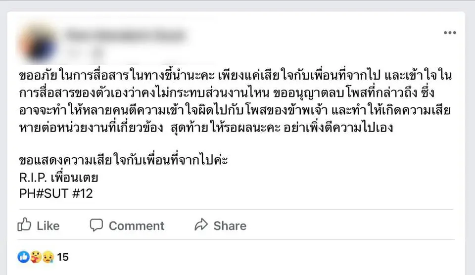 ต่อมาสาวคนเดิมออกมาโพสต์ขอโทษ ผ่านทางเฟซบุ๊กส่วนตัวเป็นที่เรียบร้อยแล้ว โดยเธอโพสต์ขอโทษที่ชี้นำ เพียงเสียใจที่เธอต้องเสียเพื่อนไป และขอลบโพสต์ดังกล่าว ซึ่งอาจจะทำให้เข้าใจผิด ทำให้เกิดความเสียหายต่อหน่วยงานที่เกี่ยวข้อง รอให้รอผล อย่าพึ่งตีความกันไปเอง