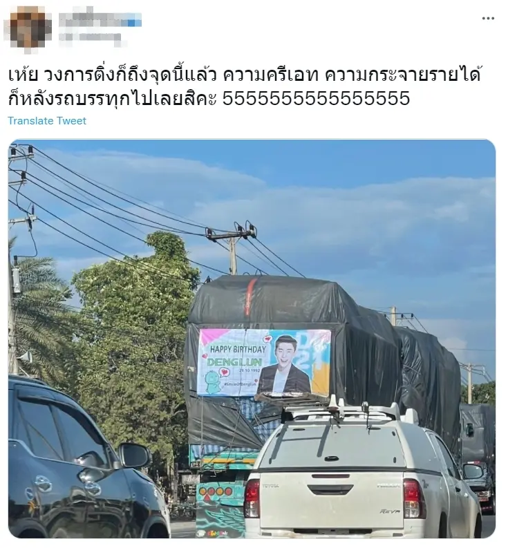 เมื่อวันที่ 25 ตุลาคมที่ผ่านมา ได้มีผู้ใช้ทวิตเตอร์รายหนึ่งทวีตรูปภาพท้ายรถบรรทุกที่ถูกขึ้นป้ายวันเกิดของ เติ้งหลุน นักแสดงชาวจีน ที่เกิดเมื่อวันที่ 21 ตุลาคม พร้อมกับระบุข้อความว่า “เห้ย วงการติ่งก็ถึงจุดนี้แล้ว ความครีเอท ความกระจายรายได้ ก็หลังรถบรรทุกไปเลยสิคะ”