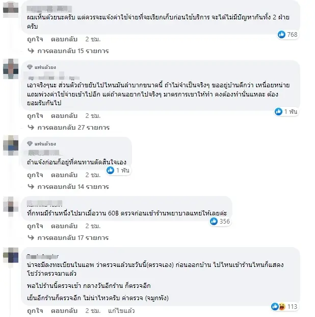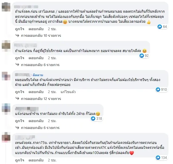 ถ้าแจ้งลูกค้าก่อน เราโอเคนะ และอยากให้ร้านค้าแต่ละร้านกำหนดมาเลย ผลตรวจไม่เกินกี่วันหลังจากตรวจก่อนจะเข้าร้าน จะได้ไม่ต้องแยงกันทุกมื้อ ไม่เจ็บจมูก ไม่เสียตังค์บ่อยๆ เซฟอะไรได้ก็เซฟอะยุคนี้ มันมีอายุกำหนดอยู่ เราว่าดีนะ บางคนจะได้ตรวจจากบ้านมาเลย ไม่เสียเวลารอด้วย