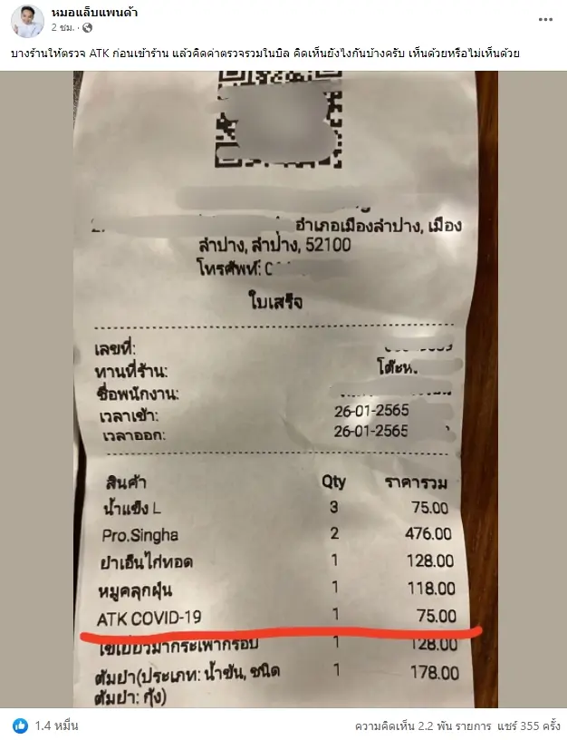 เป็นอีกหนึ่งประเด็นที่ชาวเน็ตต่างเข้ามาร่วมแสดงความคิดเห็นหลังจากที่เฟซบุ๊กเพจ หมอแล็บแพนด้า ได้โพสต์ภาพของใบเสร็จรับเงินจากร้านอาหารแห่งหนึ่งในจังหวัดลำปาง ซึ่งในรายการอาหารปรากฎค่าบริการในการตรวจโควิดแบบ ATK ราคา 75 บาท อยู่ด้วย โดยทางเพจได้ระบุข้อความเอาไว้ว่า บางร้านให้ตรวจ ATK ก่อนเข้าร้าน แล้วคิดค่าตรวจรวมในบิล คิดเห็นยังไงกันบ้างครับ เห็นด้วยหรือไม่เห็นด้วย