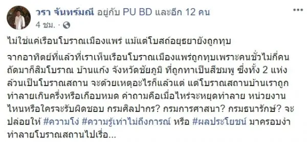 ล่าสุด ในโลกออนไลน์มีการแชร์เรื่องราวจากผู้ใช้เฟซบุ๊กรายหนึ่ง วรา จันทร์มณี ที่โพสต์ว่า ไม่ใช่แค่เรือนโบราณเมืองแพร่ แม้แต่โบสถ์อยุธยายังถูกทุบ จากอาทิตย์ที่แล้วที่เราเห็นเรือนโบราณเมืองแพร่ถูกทุบเพราะคนชั่วไม่กี่คน ถัดมาก็สิมโบราณ บ้านแก้ง จังหวัดชัยภูมิ ที่ถูกทาเป็นสีชมพู ซึ่งทั้ง 2 แห่งล้วนเป็นโบราณสถาน จะด้วยเหตุอะไรก็แล้วแต่ แต่โบราณสถานบ้านเราถูกทำลายเกินครึ่งหรือเกือบหมด คำถามคือเมื่อไหร่จะหยุดทำลาย หน่วยงานไหนหรือใครจะรับผิดชอบ กรมศิลปากร? กรมการศาสนา? กรมธนารักษ์? จะปล่อยให้ #ความโง่ #ความรู้เท่าไม่ถึงการณ์ หรือ #ผลประโยชน์ มาครอบงำทำลายโบราณสถานไปเรื่อยๆ จนหมด อย่างนั้นหรือ?