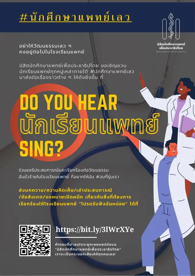 ทางนิสิตนักศึกษาแพทย์เพื่อประชาธิปไตยขออาสาเป็นกระบอกเสียงให้กับนักเรียนแพทย์ผู้ถูกกดขี่ทุกท่านได้มาระบายผ่านทางเรา “ DO YOU HEAR นักเรียนแพทย์ SING? “ เปิดรับฟังทุกปัญหาและความชั่วร้ายที่คุณพบเห็นในวัฒนธรรมของโรงเรียนแพทย์ ไม่ว่าจะเป็นในรูปของการบอกเล่าประสบการณ์ บทความ ความคิดเห็น ข้อสังเกต หรือจดหมายเปิดผนึก ส่งมาเถอะ เราอยากอ่าน!!!!
