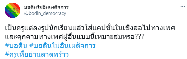 ทวิตเตอร์ดังกล่าว ได้เผยแพร่แคปชั่นของครูโรงเรียนหนึ่งย่านลาดพร้าว ที่มีพฤติกรรมไม่เหมาะสม โดยมีการถ่ายรูปนักเรียนแล้วมาโพสต์ พร้อมเขียนแคปชั่นด้วยข้อความที่คุกคามทางเพศ และแคปชั่นแนว 18+ รวมถึงใช้คำพูดที่แสดงถึงความไม่รับผิดชอบต่อหน้าที่ของการเป็นครูออกมาอย่างชัดเจน อีกทั้งยังเคยไล่เด็กไปตายอีกด้วย