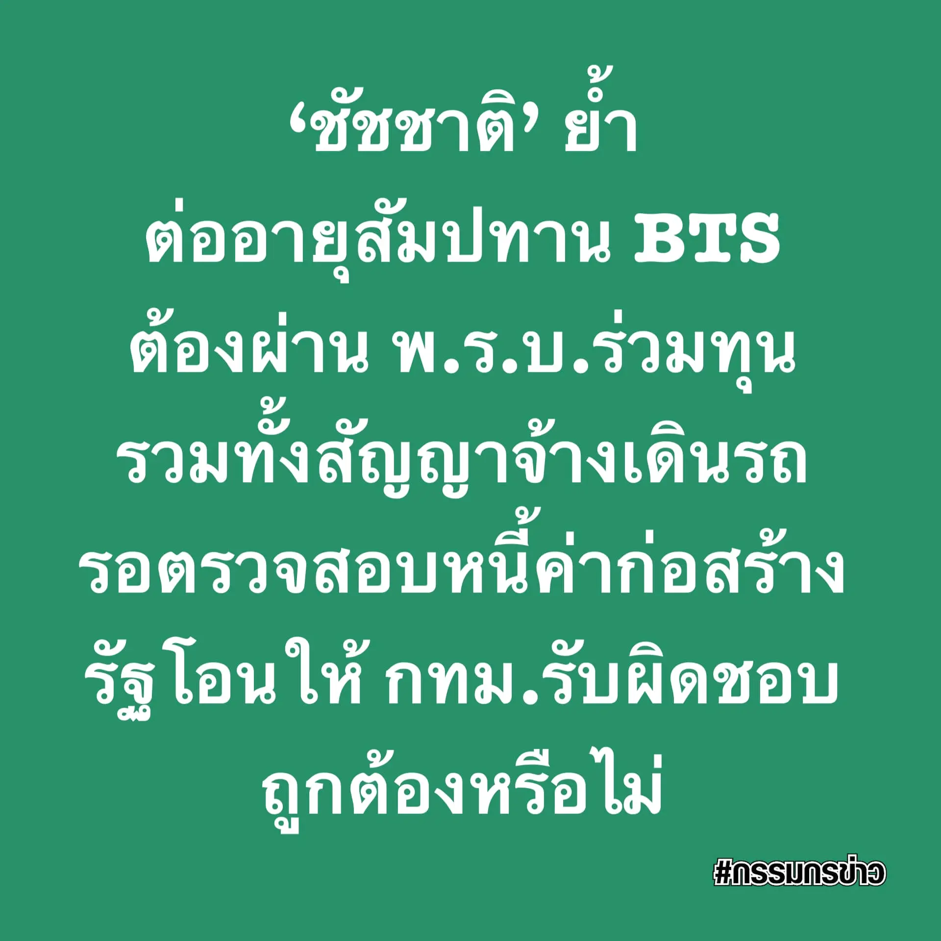 ‘ชัชชาติ’ ย้ำต่ออายุสัมปทาน BTS ต้องผ่าน พ.ร.บ.ร่วมทุน รวมทั้งสัญญาจ้างเดินรถ รอตรวจสอบหนี้ค่าก่อสร้างรัฐโอนให้ กทม.รับผิดชอบ ถูกต้องหรือไม่