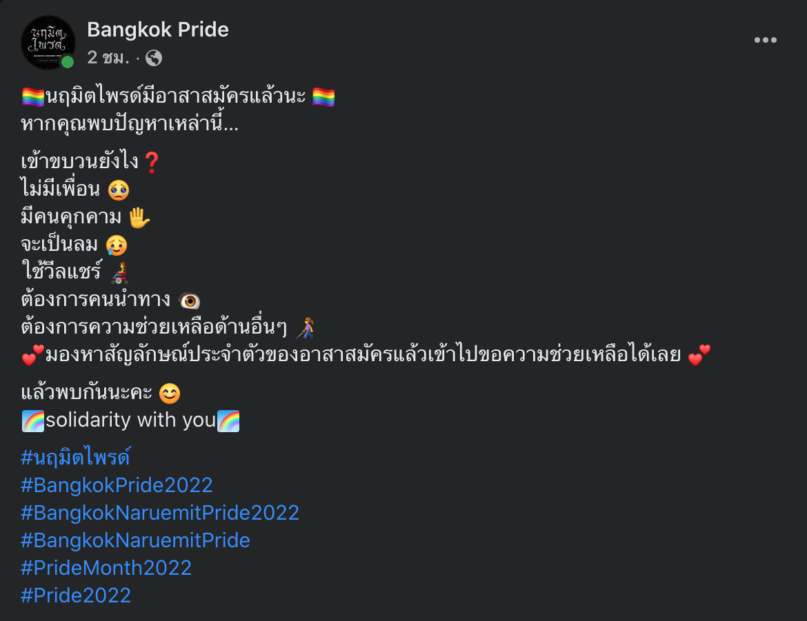 และภายในงานนี้หากผ๔เใดประสบปัญหาต่างๆ อาทิ หลงทาง ไม่ทราบว่าขบวนอยู่ที่ไหน จะเป็นลมหน้ามืด หรือโดนคุกคาม ทางผู้จัดงานได้เตรียมอาสาสมัครไว้ให้คุณแล้ว โดยโพสต์ข้อมูลผ่านเพจ Bangkok Pride ดังนี้