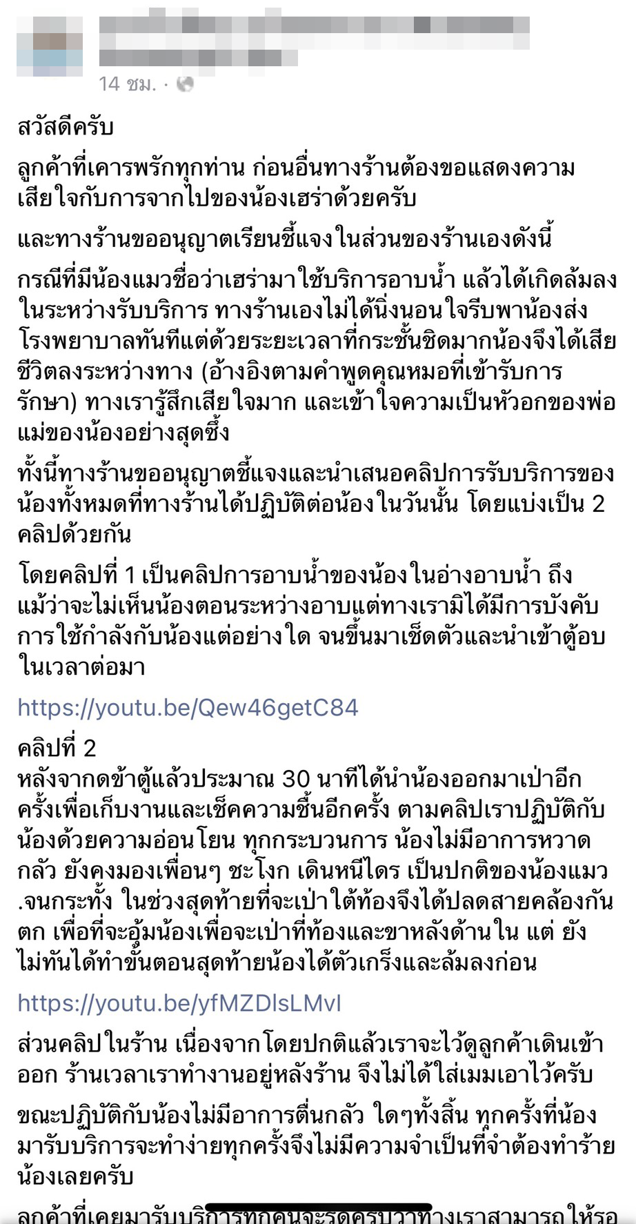 ล่าสุด เจ้าของร้านอาบน้ำ-ตัดขนสัตว์ ได้โพสต์ข้อความผ่านเฟซบุ๊ก ระบุว่า