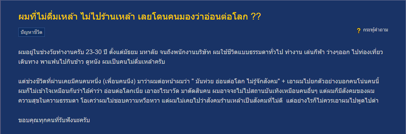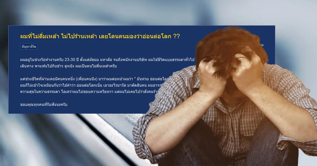 ต่างคนต่างหาความสุขให้ตัวเองในรูปแบบที่แตกต่างกัน ไม่ว่าจะไปเที่ยว ไปกิน หรือ สังสรรคกับพองเพื่อน ซึ่งความรูปในแบบของเราอาจจะไม่ใช่ความสุขในแบบของคนนี้ เราเป็นตัวเราเองย่อมต่างจากคนอื่นอยู่แล้ว เป็นเรื่องที่ไม่ได้ผิดแปลกแต่อย่างไร อย่าเช่นประเด็นที่เกิดขึ้นโลกออนไลน์ เมื่อมีผู้ชายรายหนึ่งเข้ามาตั้งกระทู้ในเว็บไซต์พันทิป เมื่อเขาที่ไม่ดื่มเหล้า ไม่ไปร้านเหล้า เลยโดนคนมองว่าอ่อนต่อโลก ??