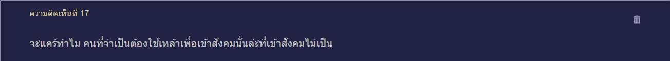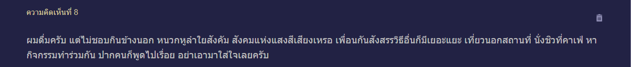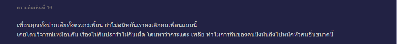 แต่ช่วงชีวิตที่ผ่านเคยมีคนคนหนึ่ง (เพื่อนคนนึง) มาว่าผมต่อหน้าผมว่า ” มันห่วย อ่อนต่อโลก ไม่รู้จักสังคม” + เอาผมไปยกตัวอย่างบอกคนโน่นคนนี้ ผมก็ไม่เข้าใจเหมือนกันว่าไอ้คำว่า อ่อนต่อโลกเนี่ย เอาอะไรมาวัด มาตัดสินคน ผมอาจจะไม่ไปสถานบันเทิงเหมือนคนอื่นๆ แต่ผมก็มีสังคมของผม ความสุขในความธรรมดา โอเคว่าผมไม่ชอบความหวือหวา แต่ผมไม่เคยไปว่าสังคมร้านเหล้าเป็นสังคมที่ไม่ดี แต่อย่างไรก็ไม่ควรเอาผมไปพูดไปด่า