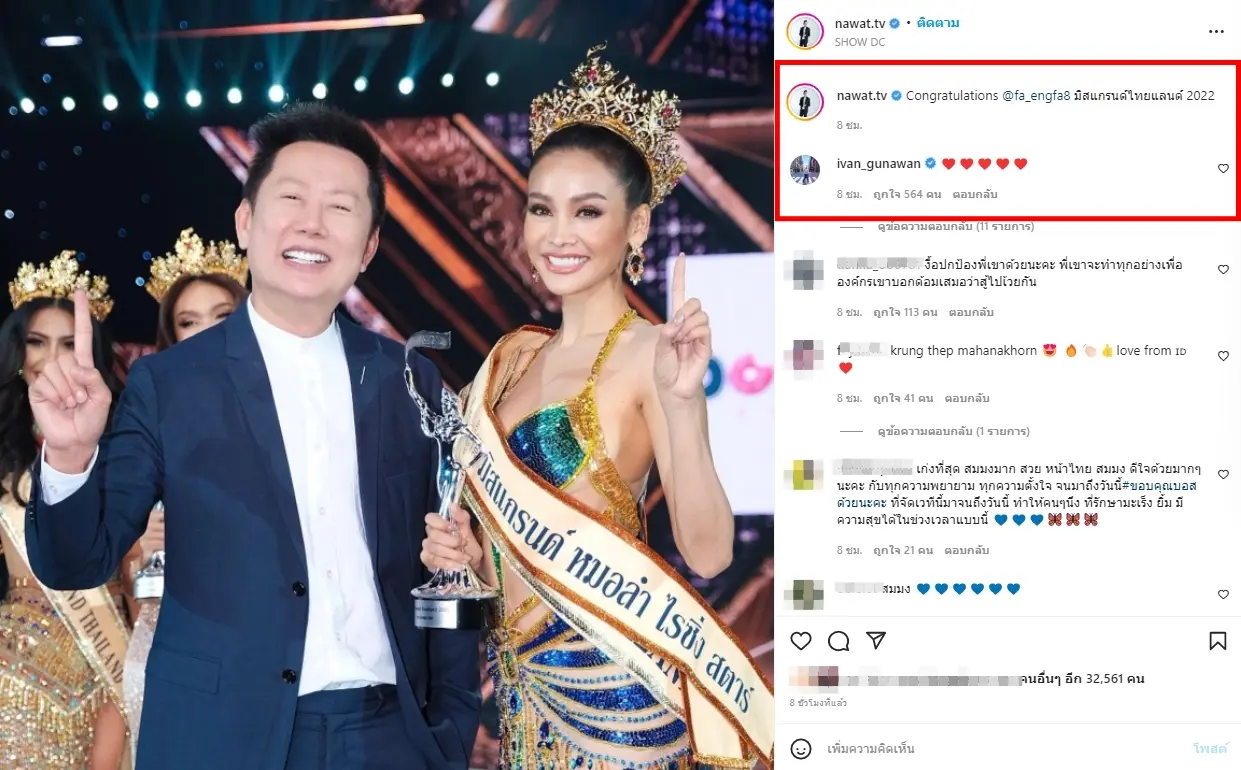 ณวัฒน์ อิสรไกรศีล และ อีวาน กูนาวาน ได้ร่วมแสดงความยินดีกับ อิงฟ้า วราหะ มิสแกรนด์ไทยแลนด์ 2565