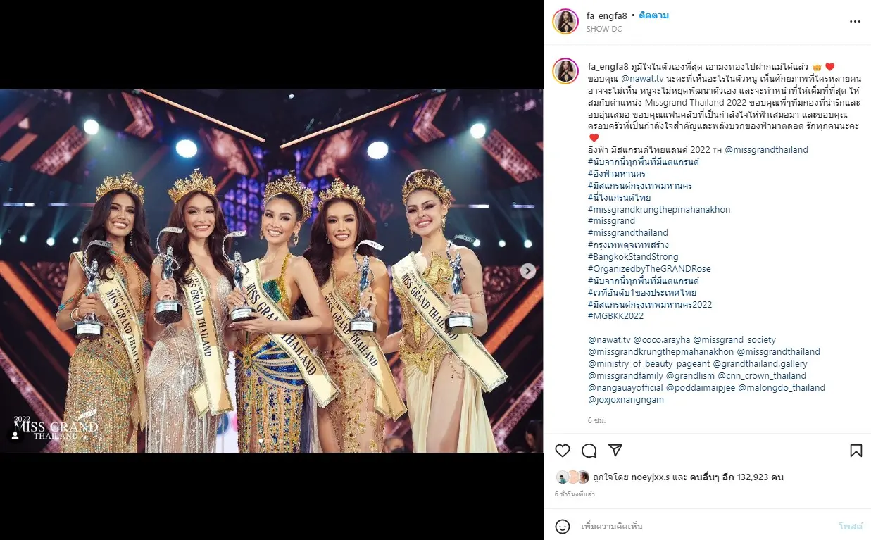 “ภูมิใจในตัวเองที่สุด เอามงทองไปฝากแม่ได้แล้ว ขอบคุณ @nawat.tv นะคะที่เห็นอะไรในตัวหนู เห็นศักยภาพที่ใครหลายคนอาจจะไม่เห็น หนูจะไม่หยุดพัฒนาตัวเอง และจะทำหน้าที่ให้เต็มที่ที่สุด ให้สมกับตำแหน่ง Missgrand Thailand 2022 ขอบคุณพี่ๆทีมกองที่น่ารักและอบอุ่นเสมอ ขอบคุณแฟนคลับที่เป็นกำลังใจให้ฟ้าเสมอมา และขอบคุณครอบครัวที่เป็นกำลังใจสำคัญและพลังบวกของฟ้ามาตลอด รักทุกคนนะคะ อิงฟ้า มิสแกรนด์ไทยแลนด์ 2022”