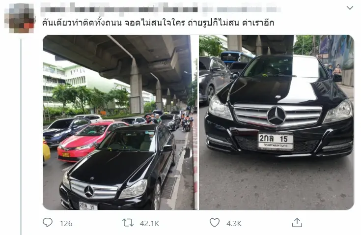 8 ต.ค. 63 โลกทวิตเตอร์แห่รีทวิต ภาพรถเมอร์เซเดส-เบนซ์ สีดำ จอดริมถนนซึ่งเป็น ขาว – แดง พร้อมระบุข้อความ คันเดียวทำติดทั้งถนน จอดไม่สนใจใคร ถ่ายรูปก็ไม่สน ด่าเราอีก