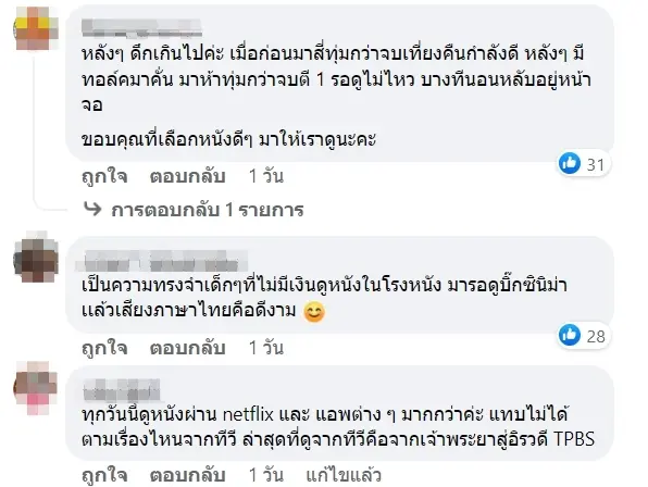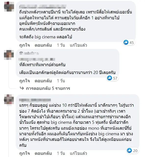 ทั้งนี้เหล่าแฟนคลับของรายการต่างเข้ามาร่วมแชร์ประสบการณ์หลังติดตาม Big Cinema มาโดยตลอด ซึ่งบางรายระบุข้อความว่า ถึงช่วงหลังๆหลายปีมานี่ จะไม่ได้ดูเลย เพราะมีสื่อให้เสพย์เยอะขึ้นแต่ก็อดใจหายไม่ได้ ความสุขในวัยเด็กอีก 1 อย่างที่หายไปยุคนั้นพีคๆมีหนังดีๆฉายเยอะมากคนเหล็ก/เกรมลินส์ และอีกหลายๆเรื่องจะคิดถึง big cinema ตลอดไป