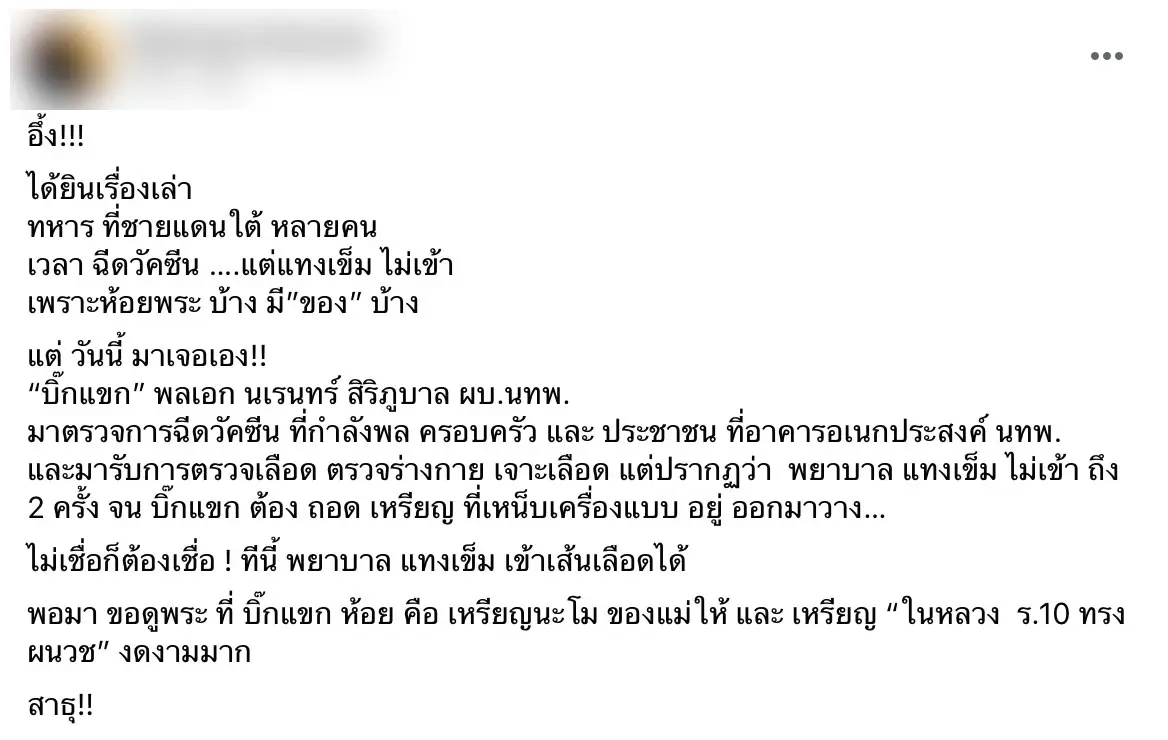 เมื่อผู้ใช้เฟซบุ๊กหลายหนึ่ง ได้โพสต์ภาพและเรื่องราวสุดอึ้งของ “บิ๊กแขก” ว่า ” ได้ยินเรื่องเล่าทหาร ที่ชายแดนใต้ หลายคนเวลา ฉีดวัคซีน ….แต่แทงเข็ม ไม่เข้าเพราะห้อยพระ บ้าง มี”ของ” บ้าง
