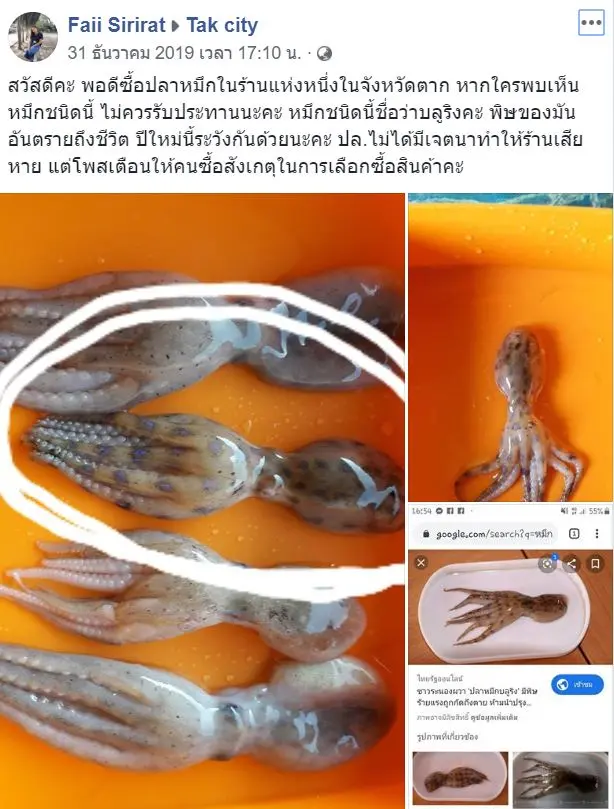 ผู้ใช้เฟซบุ๊ก Faii Sirirat ได้โพสต์ภาพเตือนภัยเกี่ยวกับการเลือกซื้อปลาหมึกในตลาดสดเมื่อวันที่ 31 ธ.ค. ที่ผ่านมา ระบุว่า “สวัสดีค่ะ พอดีซื้อปลาหมึกในร้านแห่งหนึ่งในจังหวัดตาก หากใครพบเห็นหมึกชนิดนี้ ไม่ควรรับประทานนะคะ หมึกชนิดนี้ชื่อว่าบลูริงคะ พิษของมันอันตรายถึงชีวิต ปีใหม่นี้ระวังกันด้วยนะคะ ปล.ไม่ได้มีเจตนาทำให้ร้านเสียหาย แต่โพสต์เตือนให้คนซื้อสังเกตในการเลือกซื้อสินค้าค่ะ”