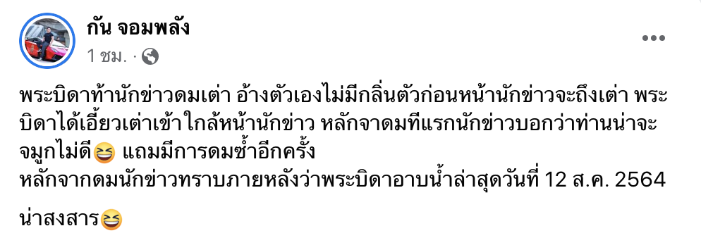 ล่าสุดอีกหนึ่งความเคลื่อนไหวในประเด็นพระบิดา ทางด้านของเฟซบุ๊ก กัน จอมพลัง โพสต์คลิปวิดีโอความยาวประมาณ 2.23 นาที พร้อมระบุข้อความในโพสต์ไว้ว่า พระบิดาท้านักข่าวดมเต่า อ้างตัวเองไม่มีกลิ่นตัวก่อนหน้านักข่าวจะถึงเต่า พระบิดาได้เอี้ยวเต่าเข้าใกล้หน้านักข่าว หลักจาดมทีแรกนักข่าวบอกว่าท่านน่าจะจมูกไม่ดี แถมมีการดมซ้ำอีกครั้ง หลักจากดมนักข่าวทราบภายหลังว่าพระบิดาอาบน้ำล่าสุดวันที่ 12 ส.ค. 2564 น่าสงสาร