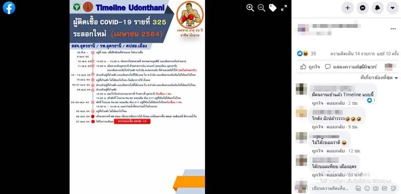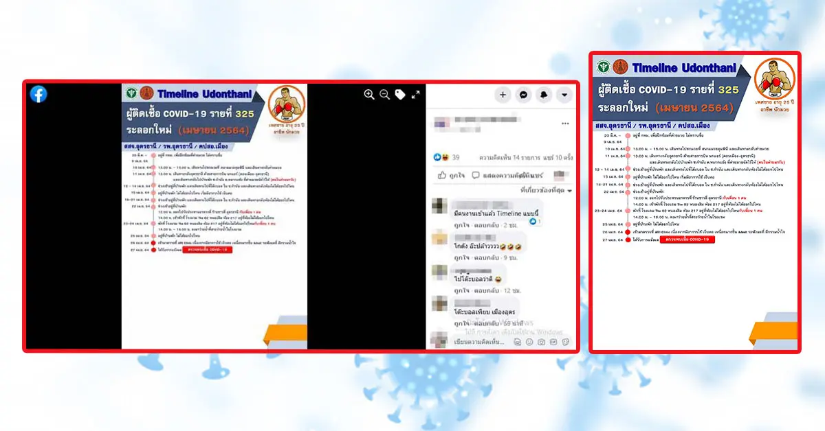 ครั้งนี้ก็เช่นกัน เมื่อจังหวัดอุดรธานี เปิดไทม์ไลน์ของผู็ติดเชื้อโควิด-19 ตามมาตรการการและขั้นตอนหลังพบผู้ติดเชื้อ แต่ประเด็นที่น่าสนใจอยู่ที่ ผู้ติดเชื้อรายที่ 325 เพศชาย อายุ 25 อาชีพ นักมวย ที่มีประวัติการเดินทางไปชกมวยที่ สวยลุมพินี และเดินทางกลับอุดรด้วยสายการปิดนกแอร์ (ดอนเมือง-อุดรธานี) ในวันที่ 10-11 เมษายน อีกทั้งยังไปโต๊ะบอลที่ซอบกำนัน และกลับมารพักที่บ้านพัก ซึ่งอยู่กับเพื่อนนักมวย ตั้งแต่วันที่ 16-21 เมษายน ก่อนเกิดอาการ และ ตรวจพบเชื่อในวันที่ 26 เมษายน