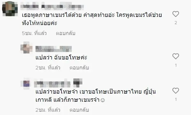 ทั้งนี้ สาวชาวต่างชาติรายนี้ยังได้กล่าวเพิ่มเติมอีกว่า “ฉันขอโทษทุกคนจริงๆในประเทศไทย ฉันเป็นลูกครึ่งเกาหลี และญี่ปุ่น และ เพลงกัมพูชาที่ฉันรักด้วย ฉันอยากจะขอโทษทุกคนที่อยู่ในประเทศไทย ขอโทษชาวเกาหลี ขอโทษชาวญี่ปุ่น และชาวกัมพูชา ฉันเสียใจมาก”