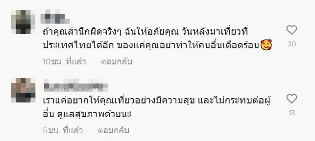 ซึ่งในช่วงท้ายคลิปจะเห็นได้ว่า เธอได้พยายามพูดขอโทษโดยเป็นภาษาต่างๆ ซึ่งมีการยกมือขึ้นมาไหว้ในแบบคนไทย งานนี้ทำเอาชาวเน็ตจำนวนมากแห่เข้าคอมเม้นท์ถึงเหตุการณ์ดังกล่าวว่า ถ้าคุณสำนึกผิดจริงๆ ฉันให้อภัยคุณ วันหลังมาเที่ยวที่ประเทศไทยได้อีก ของแค่คุณอย่าทำให้คนอื่นเดือดร้อน, เราแค่อยากให้คุณเที่ยวอย่างมีความสุข และไม่กระทบต่อผู้อื่น ดูแลสุขภาพด้วยนะ