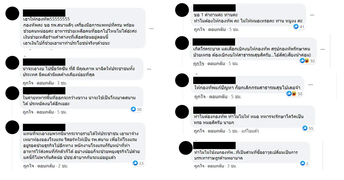 ซึ่งประเด็นนี้กลายเป็นที่พูดถึงในโลกออนไลน์ หลังจากมีการประกาศงบประมาณนี้ออกมา ก่อนหน้านี้ทางครม.ได้มีมัติอนุมัติงบประมาณแก่กระทรวงสาธารณสุข กรอบวงเงิน 321,604,000 บาท ซึ่งน้อยกว่างบประมาณที่ทางครม.อนุมัติให้กับทางกองทัพ เพื่อรับมือกับสถานการณ์การแพร่ระบาดของเชื้อ และ จัดตั้งโรงพยาบาลสนาม จึงกลายเป็นประเด็นที่ชาวเน็ตพูดถึงว่า งบครั้งนี้มากไปหรือไม่ อีกทั้งยังตั้งคำถามที่ว่า เพราะเหตุใดทำไมถึงให้งบประมาณกับทางกองทัพในการขัดการโควิด แทนที่น่าจะเอางบไปช่วยกระทรวงสาธารณสุข หรืองบประมาณในส่วนนี้น่าจะเอาไปกระจายให้ส่วนอื่นน่าจะดีกว่า