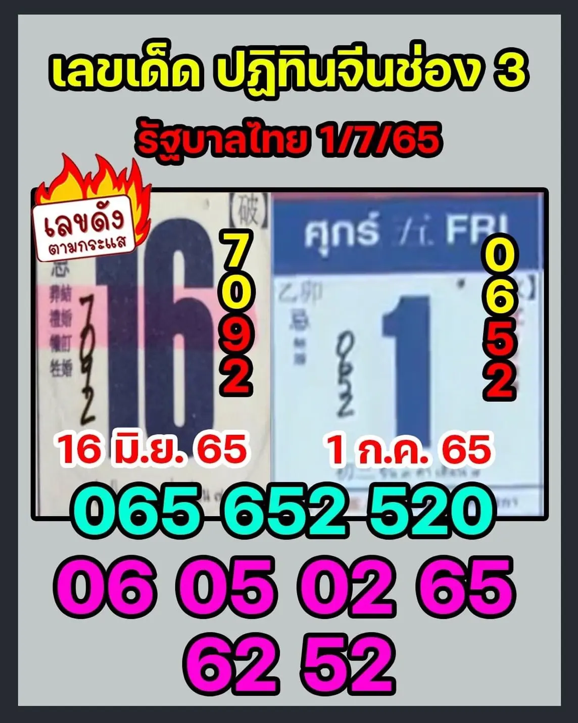 เลขเด็ด..บอกต่อ หวยปฏิทิน ช่อง3 หวยรัฐบาล แนวทางสลากกินแบ่งรัฐบาล งวดวันที่ 1 กรกฎาคม 2565 งวดก่อนเข้าตรง92