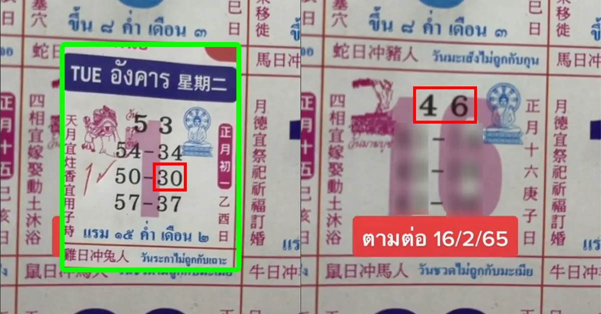ไม่รอช้า ตามต่อแบบติดๆ ไม่มีหยุดพัก เลขเด็ด หวยปฏิทิน คำชะโนด งวด 17 กุมภาพันธ์ 2565 ซึ่งงวดก่อนหน้านี้ 1/2/65 เข้าตรงๆแบบไม่กลับ สองตัว 30