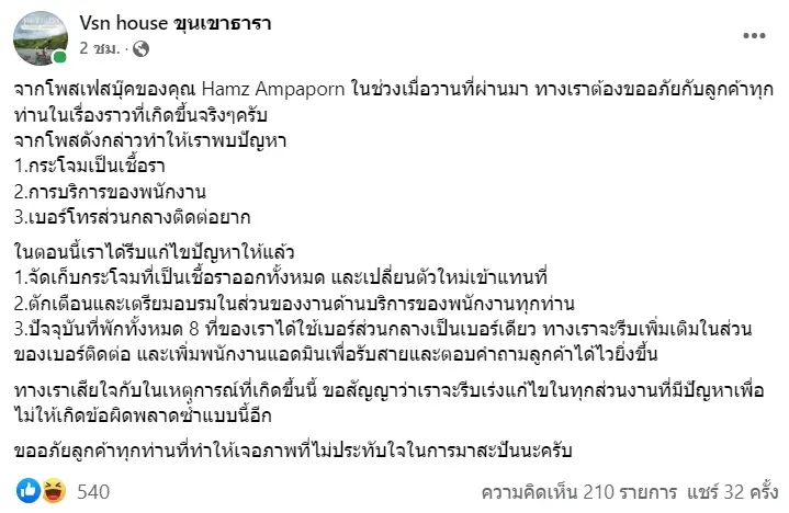 ล่าสุดทางที่พักได้ออกมาโพสต์ชี้แจงเรื่องราวดังกล่าวผ่านเฟซบุ๊กเพจ Vsn house ขุนเขาธารา โดยระบุข้อความว่า จากโพสเฟสบุ๊คของผู้เสียหายรายหนึ่งในช่วงเมื่อวานที่ผ่านมา ทางเราต้องขออภัยกับลูกค้าทุกท่านในเรื่องราวที่เกิดขึ้นจริงๆครับ จากโพสดังกล่าวทำให้เราพบปัญหา