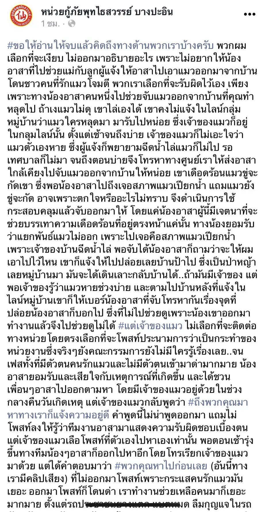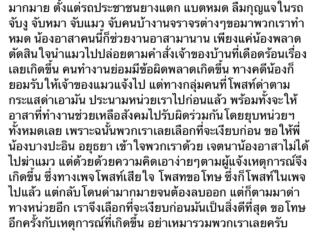 เพราะฉนั้นพวกเราเลยเลือกที่จะเงียบก่อน ขอให้พี่น้องบางปะอิน อยุธยา เข้าใจพวกเราด้วย เจตนาน้องอาสาไม่ได้ไปฆ่าแมว แต่ด้วยด้วยความคิดเอาง่ายๆตามผู้แจ้งเหตุการณ์จึงเกิดขึ้น ซึ่งทางเพจโพสท์เสียใจ โพสทขอโทษ ซึ่งก็โพสท์ในเพจไปแล้ว แต่กลับโดนด่ามากมายจนต้องลบออก แต่ก็ตามมาด่าทางหน่วยอีก เราจึงเลือกที่จะเงียบก่อนมันเป็นสิ่งดีที่สุด ขอโทษอีกครั้งกับเหตุการณ์ที่เกิดขึ้น อย่าเหมารวมพวกเราเลยครับ