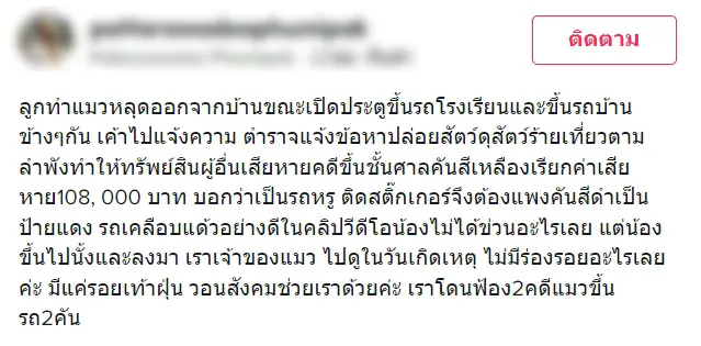 อย่างกรณีนี้ ผู้ใช้ TikTok รายหนึ่งได้โพสต์คลิปกล้องวงจรปิดของเพื่อนบ้าน พร้อมระบุข้อความว่า “ลูกทำแมวหลุดออกจากบ้านขณะเปิดประตูขึ้นรถโรงเรียนและขึ้นรถบ้านข้างๆกัน เค้าไปแจ้งความ ตำราจแจ้งข้อหาปล่อยสัตว์สัตว์ร้ายเที่ยวตามลำพังทำให้ทรัพย์สินผู้อื่นเสียหายคดีขึ้นชั้นศาลคันสีเหลืองเรียกค่าเสียหาย108, 000 บาท บอกว่าเป็นรถหรู ติดสติ๊กเกอร์จึงต้องแพง คันสีดำเป็นป้ายแดง รถเคลือบแก้ว อย่างในคลิปวีดีโอน้องไม่ได้ขวนอะไรเลย แต่น้องขึ้นไปนั่งและลงมา เราเจ้าของแมว ไปดูในวันเกิดเหตุ ไม่มีร่องรอยอะไรเลยค่ะ มีแค่รอยเท้าฝุ่น วอนสังคมช่วยเราด้วยค่ะ เราโดนฟ้อง2คดีแมวขึ้นรถ2คัน”