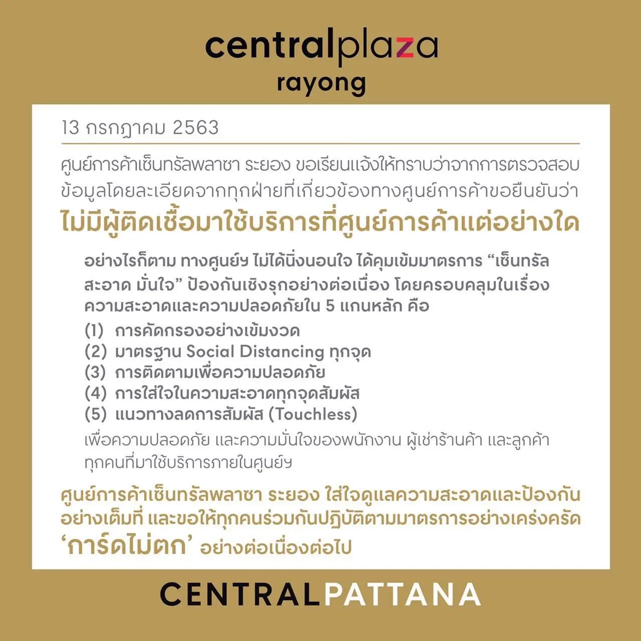 ศูนย์การค้าเซ็นทรัลพลาซ่า ระยอง ใส่ใจดูแลความสะอาดและป้องกันอย่างเต็มที่ และขอให้ทุกคนร่วมกันปฏิบัติตามมาตรการอย่างเคร่งครัด “การ์ดไม่ตก” อย่างต่อเนื่องต่อไป