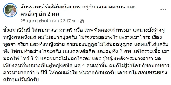 พบว่า เจ้าของจดหมายดังกล่าวใช้ชื่อเฟซบุ๊กส่วนตัวว่า จักรรินทร์ รังสิมันตุ์ธนากร เป็นผู้ที่นำสิ่งของนี้มาฝากไว้ให้ โดยภายในเฟซบุ๊กชายผู้นี้เคยลงภาพตนเองใส่ชุดแต่งกายนุ่งห่มขาว นั่งสมาธิพร้อมระบุข้อความว่า “นั่งสมาธิวันนี้ ได้พบนางธารมาตรี หรือ เทพที่คลองเจ้าพระยา แต่นางบังร่างผู้หญิงคนหนึ่งแต่ ผมไม่อยากยุ่งครับ ไม่รู้จะช่วยอย่างไร เพราะเขาโกรธ เรื่องพูดจา กริยา และทั้งหญิงชาย ถ่ายของปฏิกูลไม่ได้ขออนุญาต แต่ผมก็ได้แค่รับฟัง ให้ผมทำอย่างไรละครับ ผมแค่คนถือศิล และอยู่ทั้ง 2 ภพ แต่ใครจะเชื่อ เขาบอกให้ ไหว้ 3 ที และผมจะไปบอกใครละ และ ผู้หญิงหลังพระนางธารา ขอเพียงคนที่พบนางเป็นผู้หญิงสนิด แค่ 4 คนเท่านั้น ผมก็ไม่รู้ว่าใคร ก็ขอมอบการภาวนามากกว่า 5 ปีนี้ ให้คุณแต่งโม พ้นจากภัยนะครับ เลยขอไม่สอนธรรมของ ศรีอานย์วันนี้ครับ”