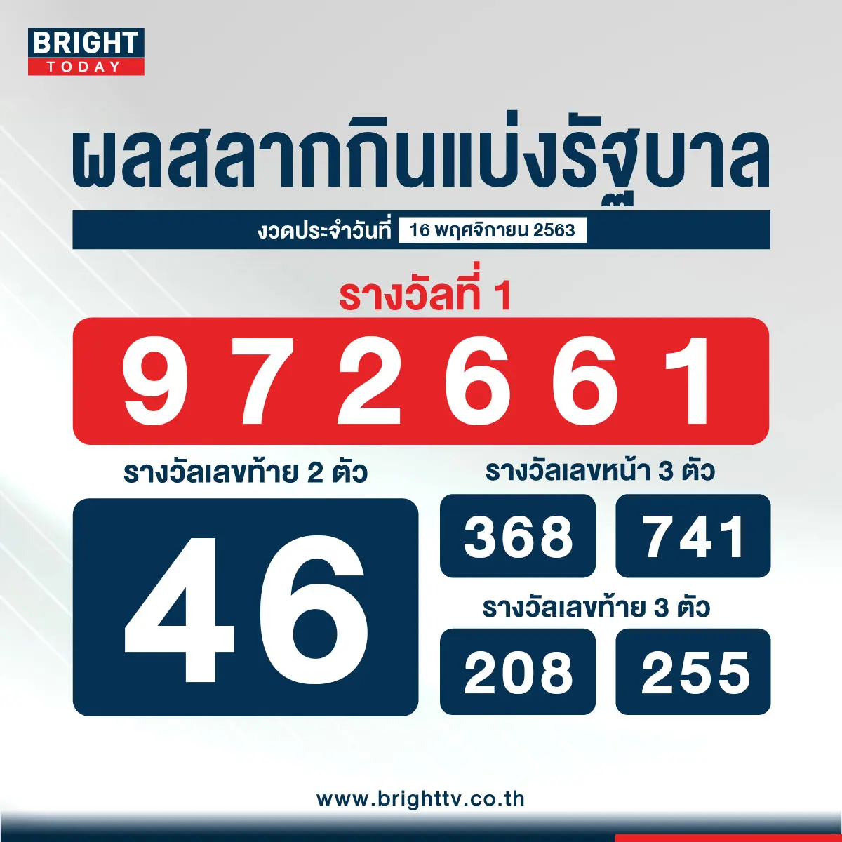 ตรวจหวย 16 พฤศจิกายน 2563 ผลสลากกินแบ่งรัฐบาล ออกรางวัลเรียบร้อยแล้ว รางวัลที่ 1 คือ 972661 – รางวัลเลขท้าย 2 ตัว คือ 46 – รางวัลเลขท้าย 3 ตัว คือ 208 – 255