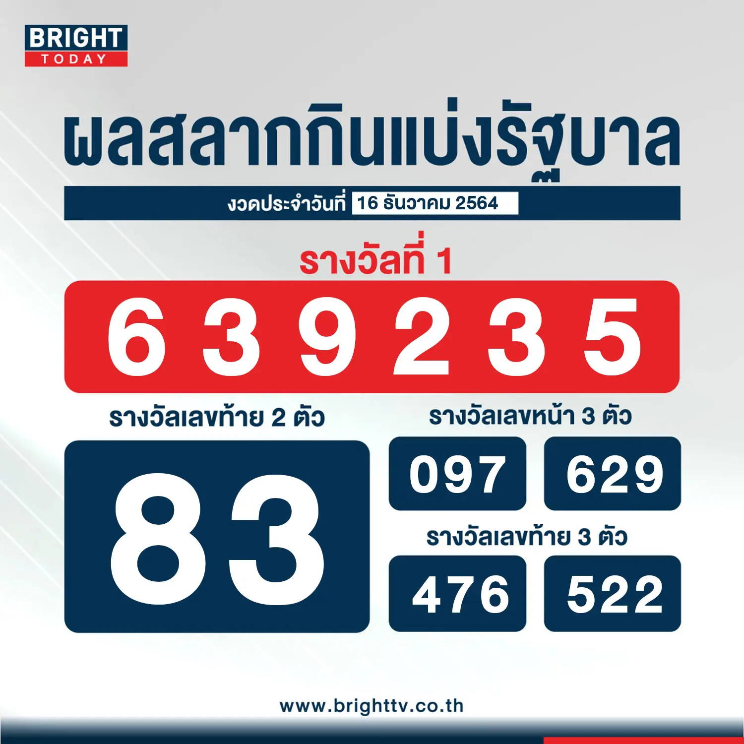 ตรวจหวย 16 ธันวาคม 2564 ผลสลากกินแบ่งรัฐบาล หรือ ลอตเตอรี่ รางวัลที่ 1 และเลขท้าย 2 ตัว – เลขท้าย 3 ตัว – เลขท้าย 3 ตัว มีดังนี้