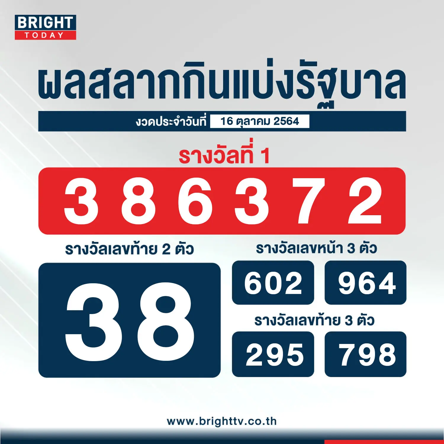 ตรวจหวย 16 ตุลาคม 2564 ผลสลากกินแบ่งรัฐบาล หรือ ลอตเตอรี่ มีดังนี้