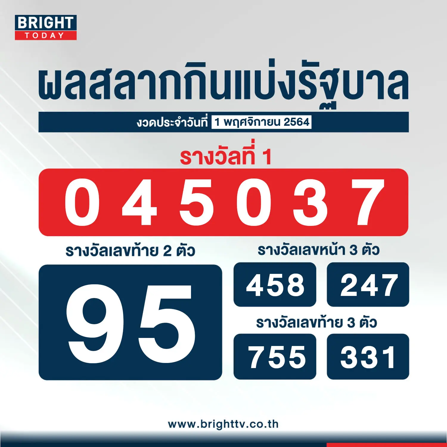 ตรวจหวย 1 พฤศจิกายน 2564 ผลสลากกินแบ่งรัฐบาล หรือ ลอตเตอรี่ มีดังนี้