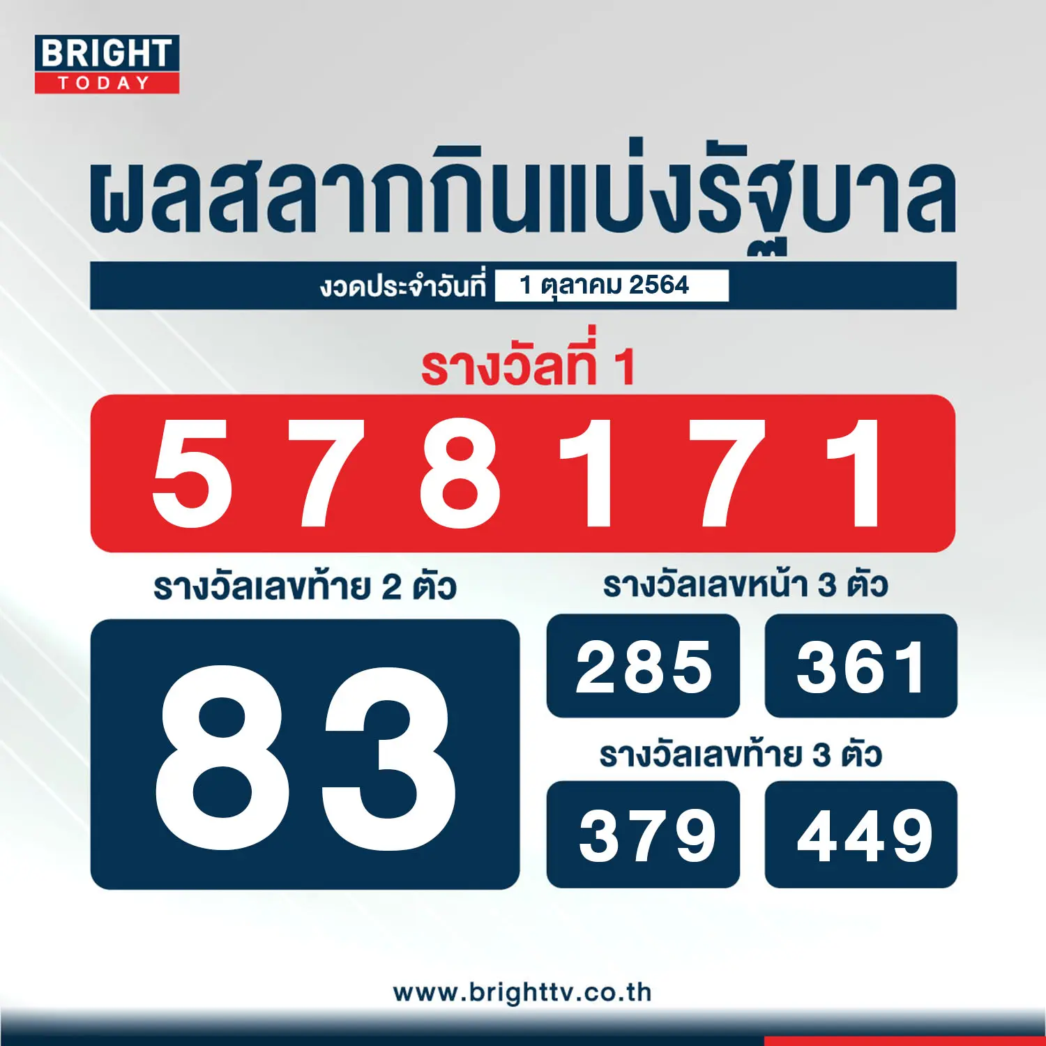 ตรวจหวย 1 ตุลาคม 2564 ผลสลากกินแบ่งรัฐบาล หรือ ลอตเตอรี่ มีดังนี้