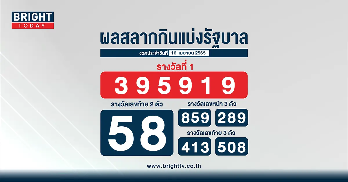 ตรวจหวย 16 เมษายน 2565 ผลสลากกินแบ่งรัฐบาล หรือ ลอตเตอรี่ รางวัลที่ 1 และเลขท้าย 2 ตัว – เลขท้าย 3 ตัว – เลขท้าย 3 ตัว มีดังนี้