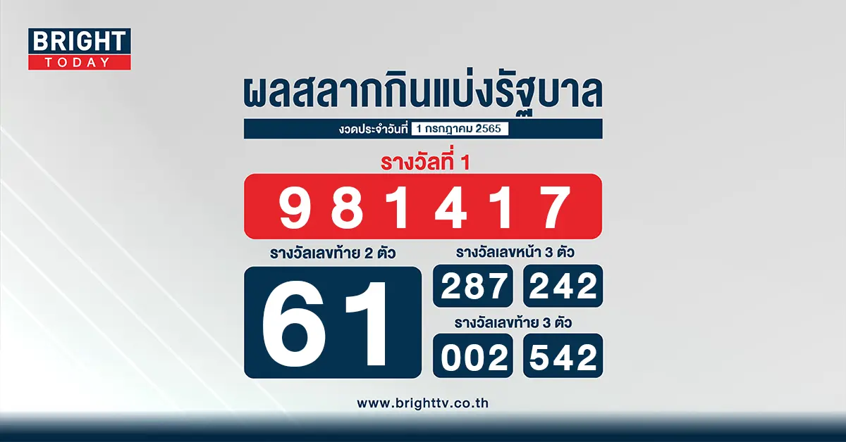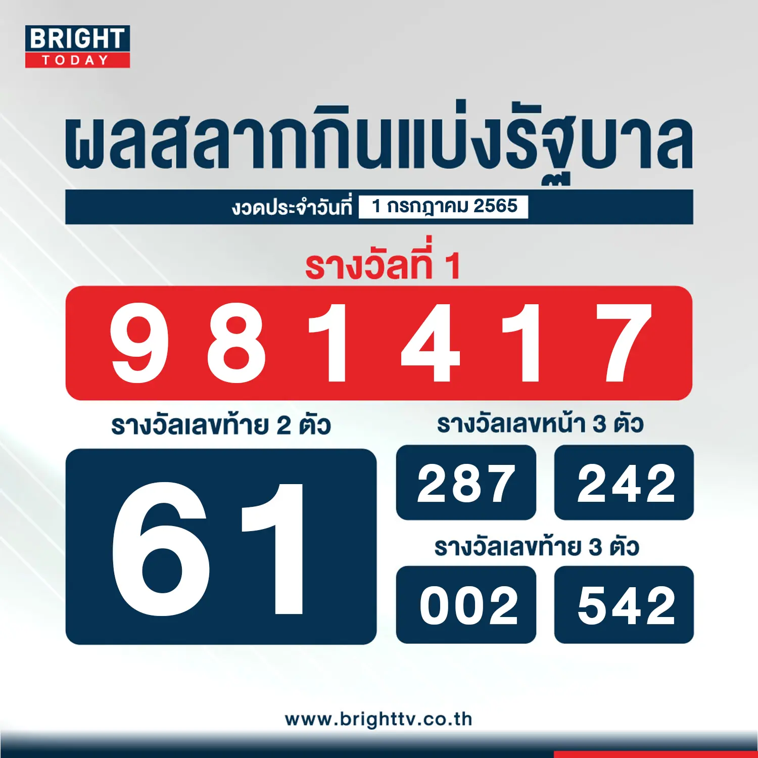 ตรวจหวย 1 กรกฎาคม 2565 ผลสลากกินแบ่งรัฐบาล หรือ ลอตเตอรี่ รางวัลที่ 1 และเลขท้าย 2 ตัว – เลขท้าย 3 ตัว – เลขท้าย 3 ตัว มีดังนี้