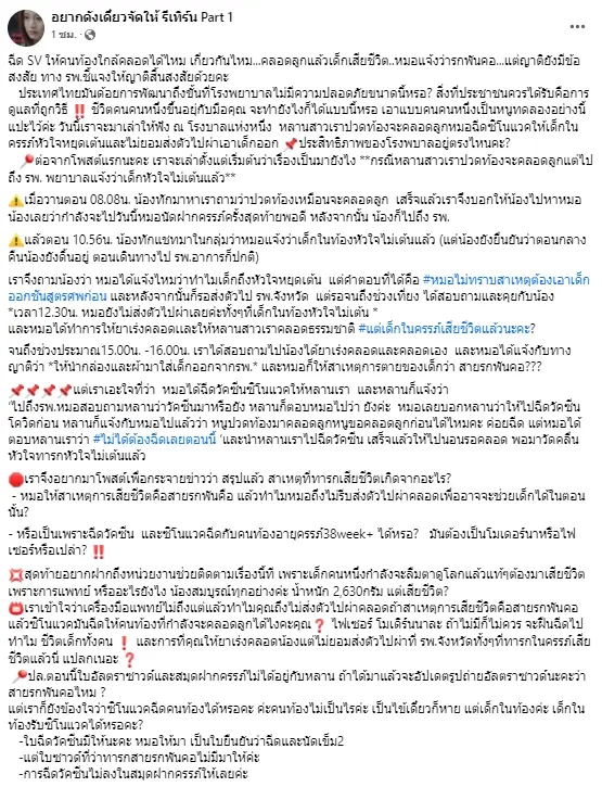 แล้วตอน 10.56น. น้องทักแชทมาในกลุ่มว่าหมอแจ้งว่าเด็กในท้องหัวใจไม่เต้นแล้ว (แต่น้องยังยื่นยันว่าตอนกลางคืนน้องยังดิ้นอยู่ ตอนเดินทางไป รพ.อาการก็ปกติ)เราจึงถามน้องว่า หมอได้แจ้งไหมว่าทำไมเด็กถึงหัวใจหยุดเต้น แต่คำตอบที่ได้คือ หมอไม่ทราบสาเหตุต้องเอาเด็กออกชันสูตรศพก่อน และหลังจากนั้นก็รอส่งตัวไป รพ.จังหวัด แต่รอจนถึงช่วงเที่ยง ได้สอบถามและคุยกับน้อง เวลา12.30น. หมอยังไม่ส่งตัวไปผ่าเลยค่ะทั้งๆ ที่เด็กในท้องหัวใจไม่เต้น และหมอได้ทำการให้ยาเร่งคลอดเเละให้หลานสาวเราคลอดธรรมชาติ แต่เด็กในครรภ์เสียชีวิตแล้วนะคะ