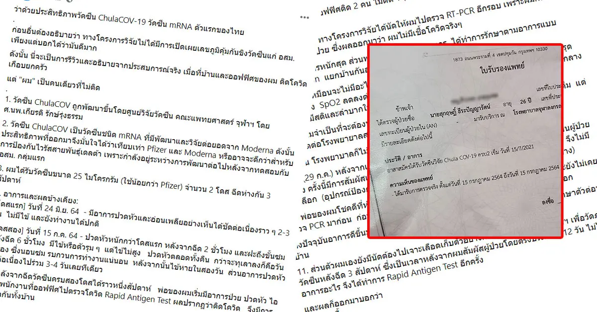 ซึ่งได้รับวัคซีนขนาด 25 ไมโครกรัม ครบทั้ง 2 โดสเป็นที่เรียนร้อย ห่างกัน 3 สัปดาห์ ซึ่งเจ้าของโพสต์เผยว่า วัคซีน ChulaCOV เป็นวัคซีนชนิด mRNA ที่มีพัฒนาและวิจัยต่อยอดจาก Moderna ดังนั้นประสิทธิภาพที่ออกมาจึงมั่นใจได้ว่าเทียบเท่า Pfizer และ Moderna หรืออาจจะดีกว่าสำหรับการป้องกันไวรัสสายพันธุ์เดลต้า เพราะกำลังอยู่ระหว่างการพัฒนาต่อไปหลังจากทดสอบกับ อสม. กลุ่มแรก