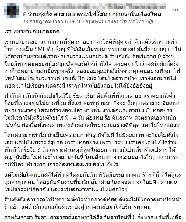 ขณะที่ผู้ใช้เฟซบุ๊กรายหนึ่ง ได้เช็กอินที่ ร้านกุ้งถัง สาขาตลาดรถไฟรัชดา เจ้าแรกในเมืองไทย พร้อมเขียนข้อความร่ายยาวถึงกรณี ปิดตลาดรถไฟรัชดา เมื่อวันที่ 28 ก.ค.ที่ผ่านมา สรุปความได้ว่า