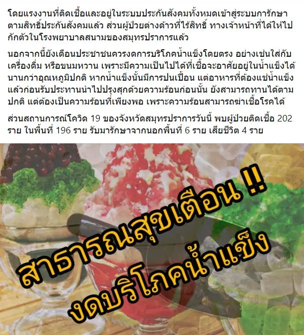 สาธารณสุขจังหวัดสมุทรปราการ ยืนยันพบ คลัสเตอร์โรงงานน้ำแข็ง จำนวนทั้งหมด 86 ราย พร้อมเตือนประชาชนงดบริโภคน้ำแข็ง
