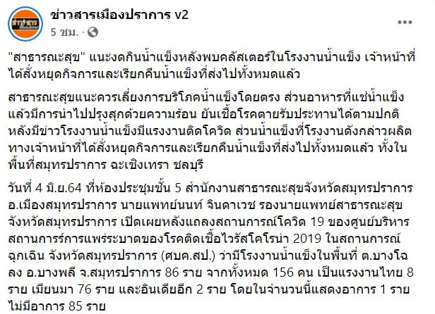 4 มิ.ย. 64 เพจเฟซบุ๊ก ข่าวสารเมืองปราการ v2 โพสต์ข้อความเกี่ยวข้องกับสถานการณ์การแพร่ระบาดของโรคโควิด-19 ระบุว่า นายแพทย์นนท์ จินดาเวช รองนายแพทย์สาธารณสุขจังหวัดสมุทรปราการ เปิดเผยหลังแถลงสถานการณ์โควิด 19 ของศูนย์บริหารสถานการร์การแพร่ระบาดของโรคติดเชื้อไวรัสโคโรน่า 2019 ในสถานการณ์ฉุกเฉิน จังหวัดสมุทรปราการ (ศบค.สป.) ว่ามีโรงงานน้ำแข็งในพื้นที่ ต.บางโฉลง อ.บางพลี จ.สมุทรปราการ 86 ราย จากทั้งหมด 156 คน เป็นแรงงานไทย 8 ราย เมียนมา 76 ราย และอินเดียอีก 2 ราย โดยในจำนวนนี้แสดงอาการ 1 รายไม่มีอาการ 85 ราย