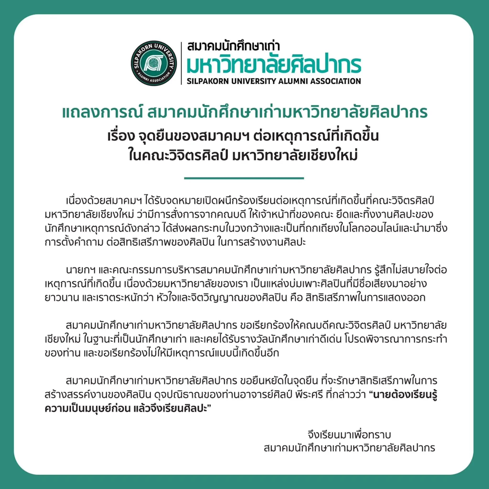 และเมื่อคืนที่ผ่านมา (23 มีนาคม) ทางสมาคมนักศึกษาเก่ามหาวิทยาลัยศิลปากร ไปออกแถลงการณ์ เรื่อง จุดยืนของสมาคม ต่อเหตุการณ์ที่เกิดขึ้น ในคณะวิจิตรศิลป์ มหาวิทยาลัยเชียงใหม่ ว่า รู้สึกไม่ค่อยสบายใจในเรื่องที่เกิดขึ้น เพราะทางศิลปากรก็เป็นแหล่งบ่มเพาะศิลปินที่มีชื่อเสียงมาอย่างยาวนาน และเราตระหนักว่า หัวใจและจิตวิญญาณของศิลปิน คือสิทธิเสรีภาพในการแสดงออก และเรียกร้องให้คณบดีวิจิตรศิลป์ มหาวิทยาลัยเชียงใหม่ ในฐานะที่เป็นนักศึกษาเก่า และเคยได้รับรางวัลนักศึกษาเก่าดีเด่น โปรดพิจารณาการกระทำของท่าน และเรียกร้องไม่ให้มีเหตุการณ์แบบนี้เกิดขึ้นอีก สมาคมนักศึกษาเก่ามหาวิทยาลัยศิลปากร ขอยืนหยัดในจุดยืน ที่จะรักษาสิทธิเสรีภาพในการสร้างสรรค์งานของศิลปิน ดุจปณิธานของท่านอาจารย์ศิลป์ พีระศรี ที่กล่าวว่า “นายต้องเรียนรู้ความเป็นมนุษย์ก่อน แล้วจึงเรียนศิลปะ”