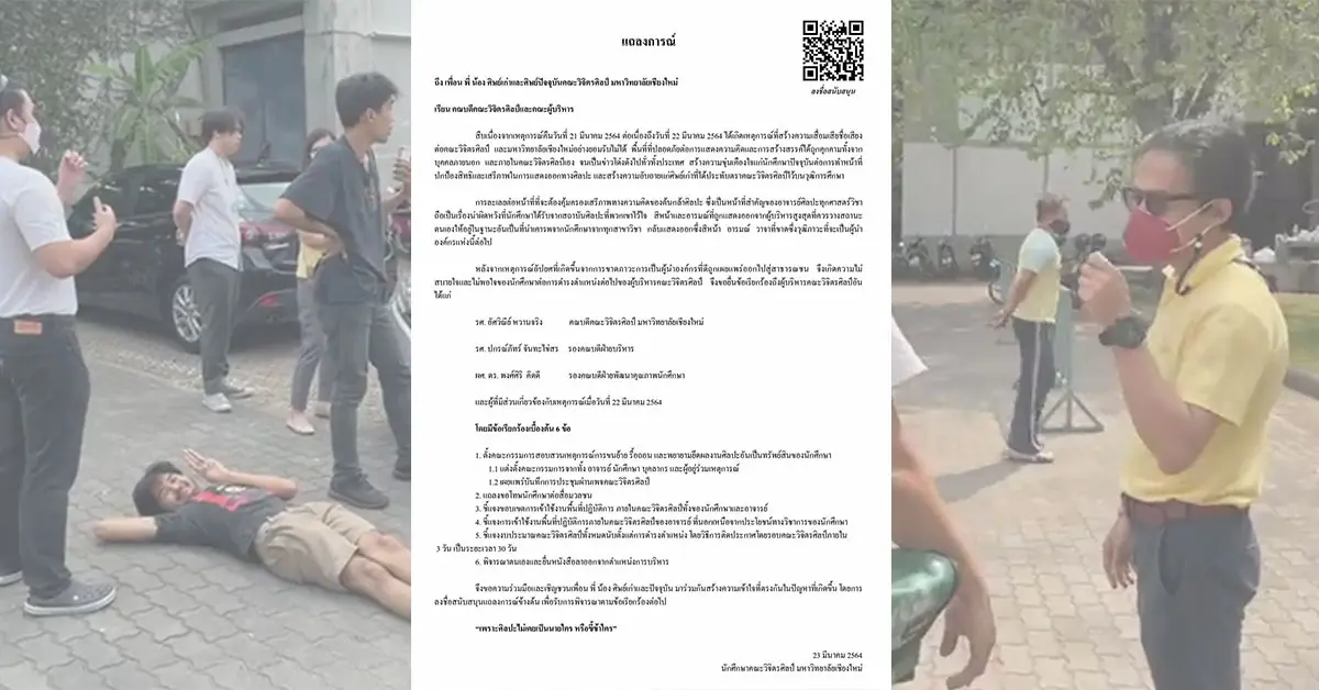 ล่าสุดนักศึกษาคณะวิจิตรศิลป์ มช. ออกแถลงถึงคณบดีคณะวิจิตรศิลป์และคณะผู้บริหาร พร้อมเปิดลงชื่อสนับสนุน จากเหตุการรื้อถอนผลงานนศ