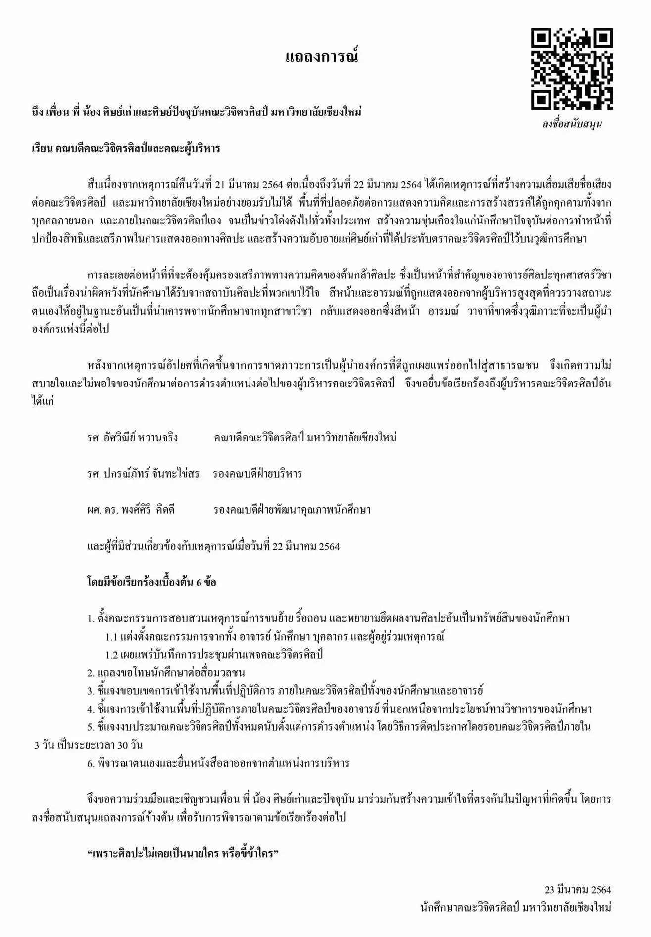 ล่าสุด วันที่ 23 มีนาคม 2564 เวลา 12.00 น. ทางนักศึกษาคณะวิจิตรศิลป์ออกหนังสือแถลงการเรียกร้องถึงผู้บริหารคณะ เกี่ยวกับเหตุการณ์ที่เกิดขึ้น เพื่อให้รับผิดชอบต่อเรื่องดังกล่าว เนื่องจากเป็นเรื่องที่สร้างความเสียหายให้ทางคณะและมหาวิทยาลัย ร่วมถึง การละเลยต่อหน้าที่ที่จะต้องคุ้มครองเสรีภาพทางความคิดของต้นกล้าศิลปะ ซึ่งเป็นหน้าที่สำคัญของอาจารย์ศิลปะทุกศาสตร์วิชาถือ และขอยื่นข้อเรียกร้องถึงผู้บริหารคณะวิจิตรศิลป์ที่มีความเกี่ยวข้องกับเหตุการณ์ พร้อมข้อเรียกร้องทั้ง 6 ข้อ